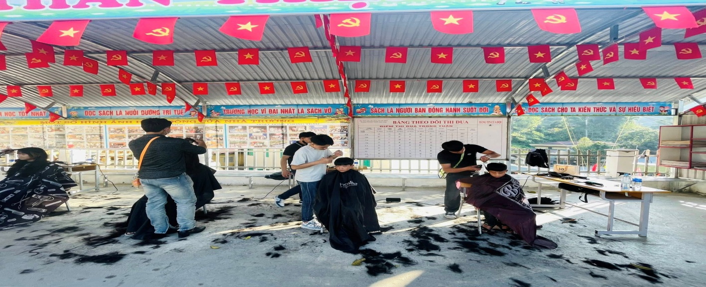 Sân trường bừng lên không khí rộn ràng đầy ấm áp. Những chiếc ghế được sắp xếp gọn gàng, máy cắt, kéo, tông-đơ được chuẩn bị chu đáo. Các anh thợ tóc và tình nguyện viên ân cần từng chút một: hỏi han, trấn an, cắt tóc cho từng em học sinh bằng tất cả sự nhiệt tình và trách nhiệm. Nhiều em tỏ ra thích thú khi lần đầu được cắt tóc bởi thợ chuyên nghiệp; khuôn mặt rạng rỡ, mái tóc mới càng khiến các em thêm tự tin và tươi vui.
